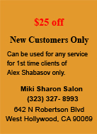 Alexander Shabasov (Alex) discovered his creative side after leaving his home in the Ukraine and settling in Israel, where he studied at Shuki Zikri, a world renowned hairdressing academy. His training has expanded and deepened over the years, as a result of the relationships he nurtured with other expert stylists in Tel Aviv, and having successfully completed programs, such as L'Oréal Professional, Schwarzkopt Professional and Goldwell. Currently, he brings his passion and technical saavy of cutting, color and style to the MikiSharon salon in West Hollywood